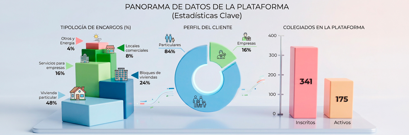 El balance del primer año de funcionamiento arroja otras cifras que demuestran la eficacia del modelo. Hasta la fecha, se han gestionado 531 encargos profesionales (un 84% de particulares y un 16% de empresas), número que evidencia una demanda real y sostenida por parte de la sociedad. Esta actividad se traduce en una confianza mutua que los usuarios han ratificado con una valoración media sobresaliente, de 4,86 puntos sobre 5. Pero más allá del volumen, lo llamativo ha sido la capacidad de adaptación. La plataforma ha demostrado ser flexible al integrar nuevas tipologías de servicios y nichos emergentes, como los Certificados de Ahorro Energético (CAE). De hecho, la diversificación ya es una realidad: el 48% de los encargos corresponden a vivienda particular, el 24% a bloques de viviendas, el 16% a servicios para empresas, el 8% a locales comerciales y el resto a otras edificaciones y nuevos servicios energéticos.
